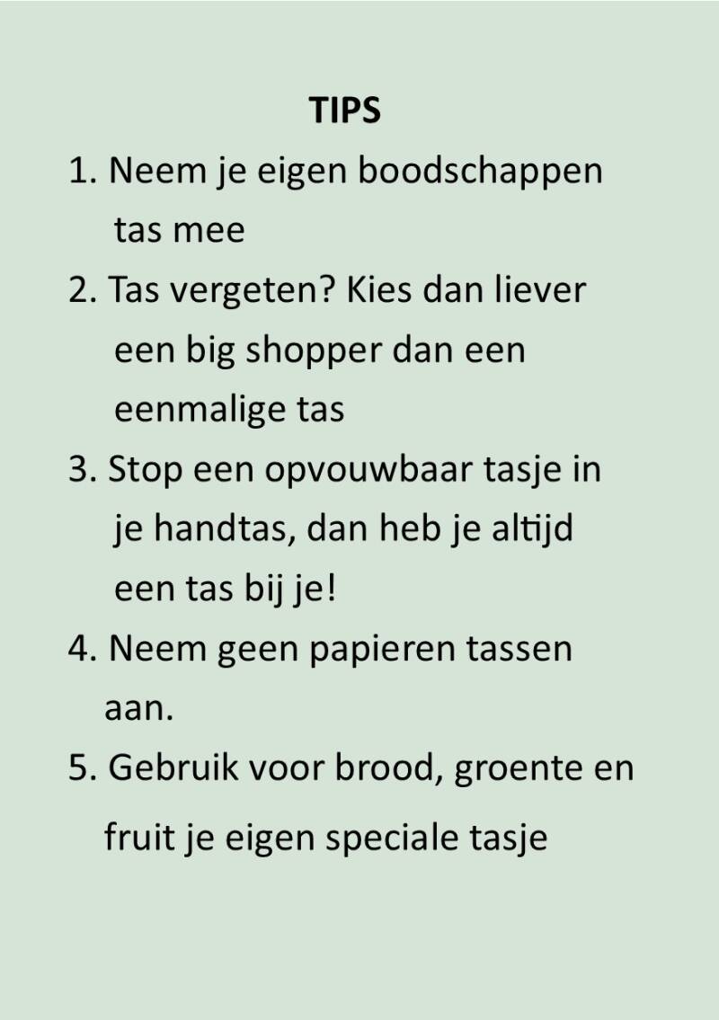 Het meest milieuvriendelijk is een stevige tas van (gerecycled) polypropyleen, PET of jute. Zelfs een opvouwbaar nylon tasje is een duurzame keuze. Zoals eerder gezegd: een tas of netje van katoen kan ook mits je hem vaker dan 75 keer gebruikt. Het nettasje dat ik jaren geleden gekocht heb (omdat het me aan m’n oma doet denken) gaat al jaren mee. Superhip en onverwoestbaar. Een draagtas met stevig plastic handvat die bij de kassa van de supermarkt is eveneens goed, mits je hem vaker dan 10 keer gebruikt. En voor groente, fruit en brood neem je uiteraard je eigen zakjes mee naar de winkel/markt. Eigenlijk komt het er op neer dat je de katoenen tasjes uit de kast moet gebruiken tot ze tot de draad versleten zijn. Als ik naar de shopper kijk waar ik de katoenen tasjes in bewaar, kan ik nog een hele tijd vooruit!